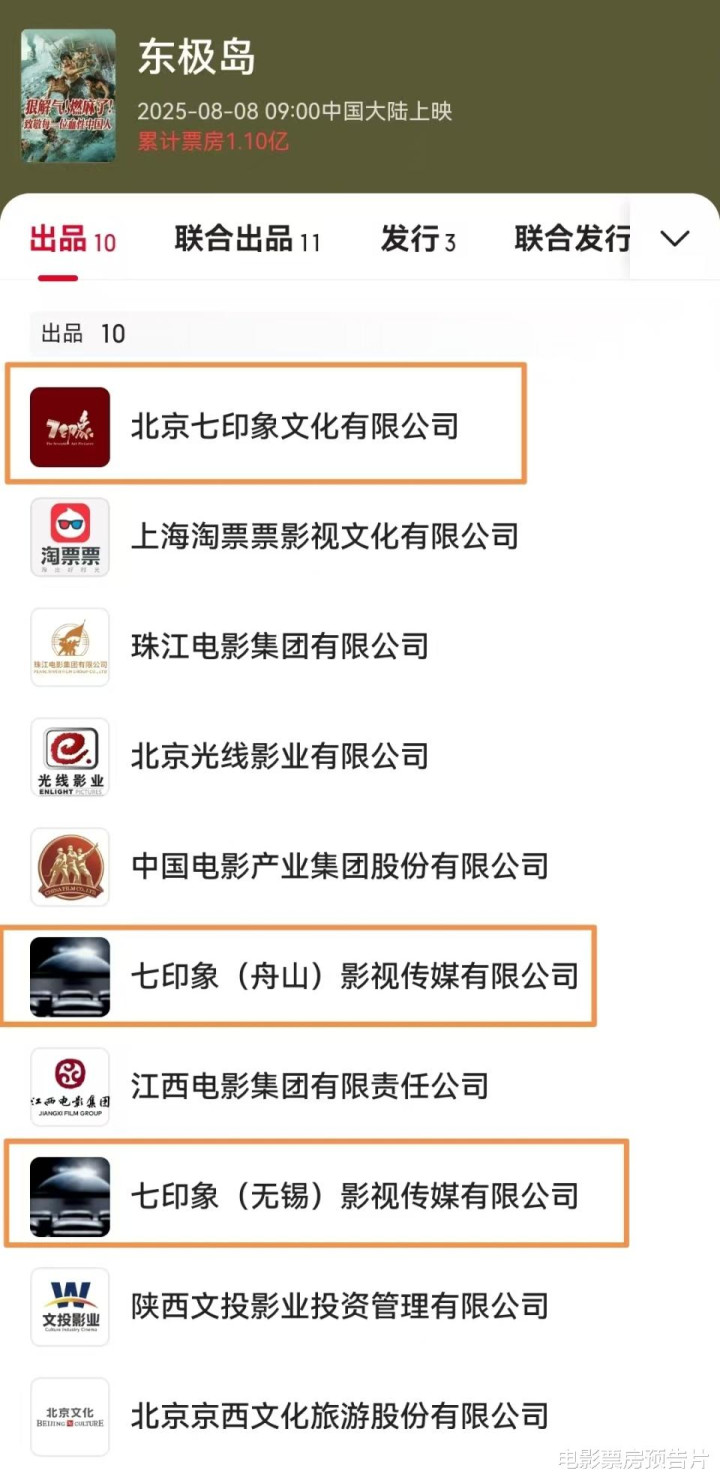 《东极岛》的制作出品方主要有10家,北京七印象文化公司排在第一位,后面还有两家分公司,其余都是合作出品方,包括春节档制作出品《哪吒2》的光线传媒和出品《封神2》的北京文化等。